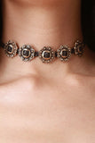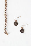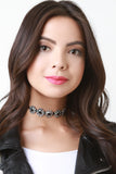 This cute choker necklace features a braided vegan leather fabrication, five decorative buckle charms, matching earrings, and an adjustable lobster claw closure.