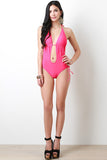 This solid tone monokini features a triangle top with removable padded cups, self-tie halter neckline, scoop center, self-tie back, and side tie brief bikini bottom. Fully lined. Accessories sold separately. 80% Nylon, 20% Spandex. Lining: 100% Polyester.