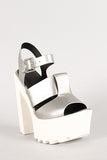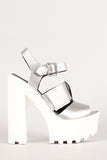 Featuring metallic leatherette upper, open toe, strappy design, slingback with adjustable buckle closure, lug sole, chunky platform and heel. Finished with cushioned insole for comfort.