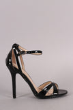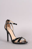 This open toe heel has two cross straps on the upper vamp with a rear back closure. Features a slingback strap that forms into an ankle strap as well. Finished on a leg-lengthening stiletto heel.