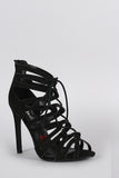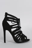 This alluring heel features a peep toe silhouette, strappy construction with corset-style lace up detail, stitching accents, and stiletto heel. Finished with lightly padded insole and rear zipper closure for easy on/off.