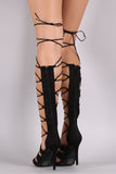 This stunningly chic heel features an open toe silhouette, strappy construction with lace up design, and wrapped stiletto heel. Finished with lightly padded insole and rear zipper closure for easy on/off.