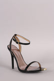 This lovely gold tip heel features a glossy patent upper, metallic accent at toe, and wrapped stiletto heel. Finished with lightly padded insole and adjustable ankle strap with buckle fastening.
