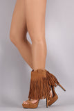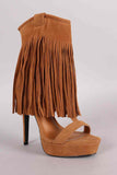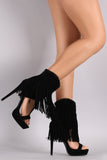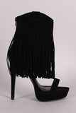 This stunning fringe detailing, single strap across vamp, and tribute platform. Finished with lightly padded insole, wrapped stiletto heel, and convenient back-zip closure.