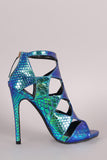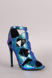 This stunning heel features a snake embossed hologram vegan leather upper with unique cutout design, peep toe silhouette, and wrapped stiletto heel. Finished with lightly padded insole and convenient back-zip closure.