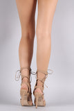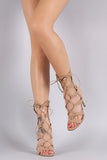 This eye-catching open toe heel features a strappy construction, corset lace up closure, open toe silhouette, and wrapped stiletto heel. Finished with a lightly padded insole, and side zip-up closure for convenience.