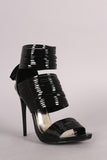 This stiletto heel features a strappy construction with stitched trims, open toe silhouette, lightly padded insole, and tassel back-zip closure.