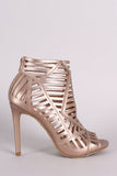 This peep toe heel features a geometric cutout design, stitching accents, and wrapped stiletto heel. Finished with lightly padded insole and back-zip closure.