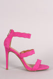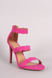 This gorgeous heel features an open toe silhouette, triple scalloped straps, and wrapped stiletto heel. Finished with lightly padded insole and rear zipper closure for easy on/off.
