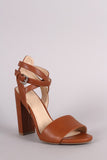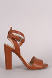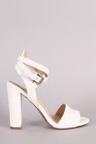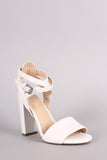 This sophisticated heel features an open toe silhouette, one band across vamp, chunky wrapped heel, lightly padded insole, and crisscrossing ankle strap with buckle fastening.
