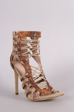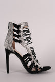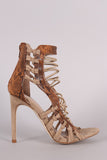 This fashionable heel features a strappy caged construction with python print vegan leather trims, open toe silhouette, knotted detail at side, and wrapped stiletto heel. Finished with lightly padded insole and convenient back-zip closure.