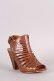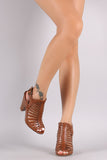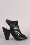 This trendy heel features a caged cutout design with side buckle accent, peep toe silhouette, and chunky stacked heel. Finished with lightly padded insole and side zipper closure for easy on/off.