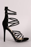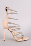 This sophisticated heel features multiple rhinestone-encrusted straps across vamp, open toe silhouette, and wrapped stiletto heel. Finished with a rear zipper fastener and lightly cushioned insole for comfort.