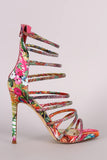 This beautiful heel features multiple rhinestone-encrusted straps across vamp, vibrant floral print throughout, open toe silhouette, and wrapped stiletto heel. Finished with a rear zipper fastener, and lightly padded insole.