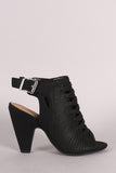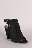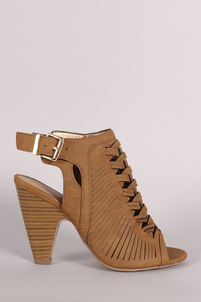 This heel features a vegan leather upper with slashed design, open toe, woven detail, and adjustable buckle strap closure. Finished with a cone stacked heel and lightly padded insole.