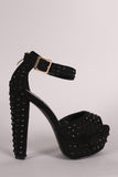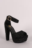 This eye-catching heel features a peep toe silhouette, studded spike embellishment throughout, adjustable ankle strap, and chunky platform heel. Finished with a lightly padded insole and convenient back-zip closure.