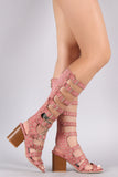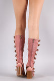 This edgy heel features a multiple laddered straps with adjustable buckles accent, studded hardware detail throughout, and block stacked heel. Finished with a lightly padded insole and rear zipper closure for easy on/off.