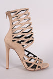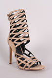 This striking heel features a caged ankle cuff design, open toe silhouette, single sole, and wrapped stiletto heel. Finished with lightly padded insole and rear zipper closure for easy on/off.