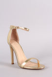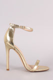 This open toe heel features a single strap across vamp, ankle strap with an adjustable buckle closure, and wrapped stiletto heel. Finished with a lightly padded insole for comfort.