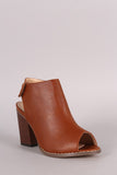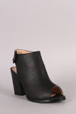 These booties feature a peep toe silhouette, vertical seam from top of the vamp to toe, back cutout detail, and chunky stacked heel. Finished with cushioned insole and slingback strap with hook & loop closure.