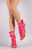 This lovely open toe heel features a strappy construction with self-tie chiffon lace-up closure and wrapped stiletto heel. Finished with lightly padded insole and rear zipper closure.