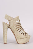 This peep toe heel features a shimmery glitter throughout, caged cutout design, wrapped platform, thick heel, and lightly padded insole. Finished with a hook and loop slingback strap closure.