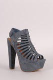 This peep toe heel features a denim print throughout, caged cutout design, wrapped platform, thick heel, and lightly padded insole. Finished with hook and loop slingback strap closure.