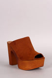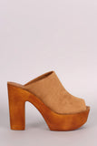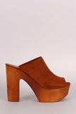 This edgy heel features a peep toe silhouette, closed vamp vegan suede upper, and faux wooden platform with chunky heel. Finished with a lightly padded insole for comfort.