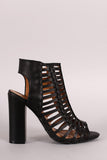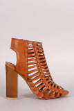 This edgy heel features a vegan leather upper, caged strappy huarache construction, peep toe silhouette, and faux wooden chunky heel. Finished with a side zip-up closure and lightly padded insole.