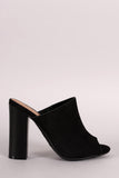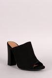 This simply chic heel features a closed vamp vegan suede upper, peep toe silhouette, open back, and faux wooden chunky heel. Finished with a lightly cushioned insole for comfort and an elastic gore inset.