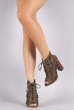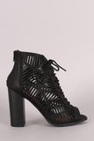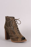 These stylish booties feature a geometric cutout design upper, peep toe silhouette, lace-up front, and chunky stacked heel. Finished with a cushioned insole and rear zipper closure.