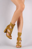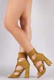 This edgy heel features a strappy construction with metallic hardware accent, peep toe silhouette, high shaft design, and chunky wrapped heel. Finished with a lightly cushioned insole and rear zipper closure for easy on/off.