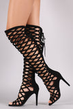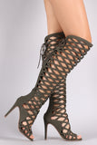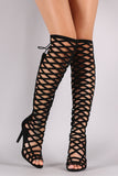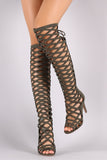 These edgy over-the-knee boots feature a diamond cutout design, peep toe silhouette, wrapped stiletto heel, and lightly cushioned insole for comfort. Finished with back zipper and partial lace-up closure.
