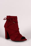 These chic booties feature a vegan suede upper, side-stitched strappy vamp with lace-up closure, peep toe silhouette, and wrapped chunky heel. Finished with a lightly cushioned insole and side zipper fastener for easy on/off.