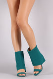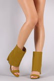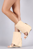 This heel feature a covered boot shaft around the upper ankle area with a decor back zipper. Open toe silhouette. Finished on a wedged heel.