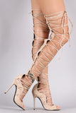 This striking heel features an open toe silhouette, wavy vamp design with self-tie lace-up closure, and wrapped stiletto heel. Finished with lightly padded insole and rear zipper closure.