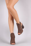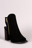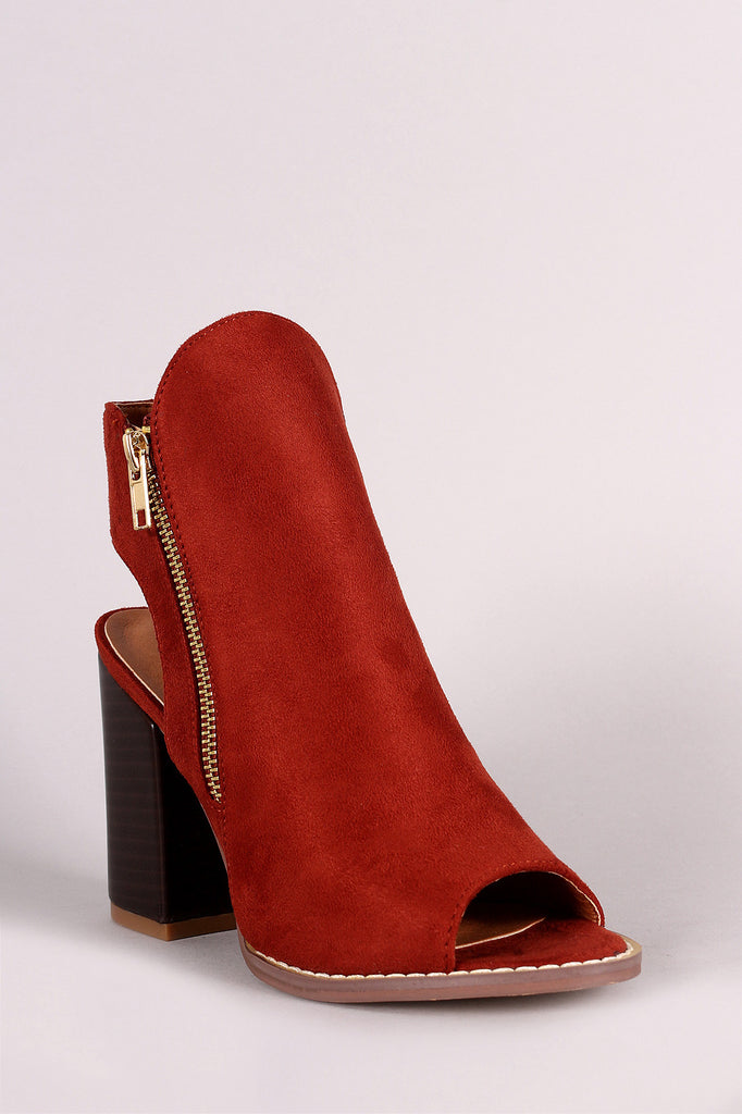 These eye-catching booties feature a vegan suede upper, double-side zipper construction, peep toe silhouette, back cutout opening, and stacked chunky heel. Finished with a lighty cushioned insole for comfort.