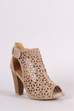 These booties features a closed rear back and a peep toe opening. Designed with side slits and a perforated cage, featuring a loop and adhesive tape closure. Finished on a chunky heel.