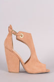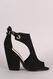 These gorgeous booties feature a peep toe silhoutte, caged vamp with side cutouts, grommet accent with adjustable buckle strap, and wrapped chunky heel. Finished with a lightly padded insole for comfort.