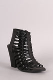 These chunky heel booties feature a strappy cage design with an adjustable inner side zipper. Rear cutout with open toe. Finished on a tapered stacking chunky heel.