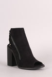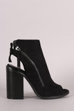 These edgy booties features a peep toe silhouette, chunky stacked heel, lightly padded insole, back pull loop, and slanted side zipper closure for easy on/off.