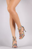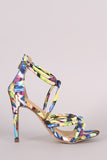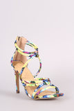 This stunning heel features a kaleidoscope print fabric, strappy construction with knotted detail, and open toe silhouette. Finished with a lightly padded insole, wrapped stiletto heel, and back zip closure.