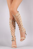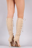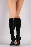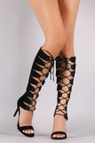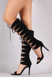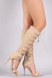 These knee high heel feature a soft vegan suede upper, open toe silhouette, back zipper with an adjustable lace up closure, and wrapped stiletto heel. Finished with a lightly padded insole and vegan leather lining.