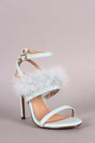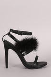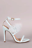 This gorgeous heel features an instep strap with delicate feather accent, open toe silhouette, wrapped stiletto heel, and adjustable ankle strap with buckle fastening. Lightly padded insole for comfort.