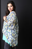 This kimono features a flowy knit fabrication with floral print design, open front fit, short sleeves, and handkerchief hemline finish. Accessories sold separately. Made in U.S.A. 100% Polyester.