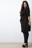 This plus size longline cardigan features a breezy textured chiffon, flap collar with open front construction, elbow sleeves with buttoned tab accent, and removable sash tie at waist. Accessories sold separately. Made in U.S.A. 100% Polyester.