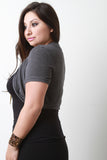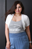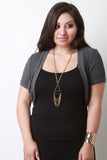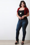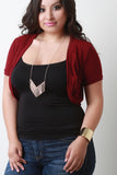 This plus size cardigan features an open front construction, short sleeves, ribbed knit trims, and crop hem. Accessories sold separately. Made in U.S.A. 46% Polyester, 46% Rayon, 8% Spandex.