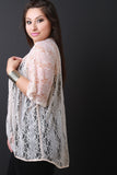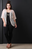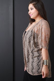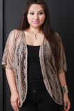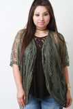 This plus size cardigan features a semi-sheer lace fabrication, draped open front construction, and short sleeves design. Accessories sold separately. 92% Nylon, 8% Spandex.
