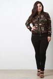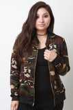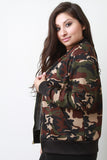 This plus size bomber jacket features a stretchy smooth knit with camouflage prints, zip-up front, long sleeves with banded cuff, and contrast hemline. Accessories sold separately. 96% Polyester, 4% Spandex.
