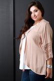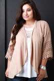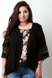 This plus size cardigan features a textured woven fabric, open front constuction, and elbow sleeves fit with crochet scallop-ended design. Finished with a high-low hemline. Accessories sold separately. Made in U.S.A. 100% Rayon.
